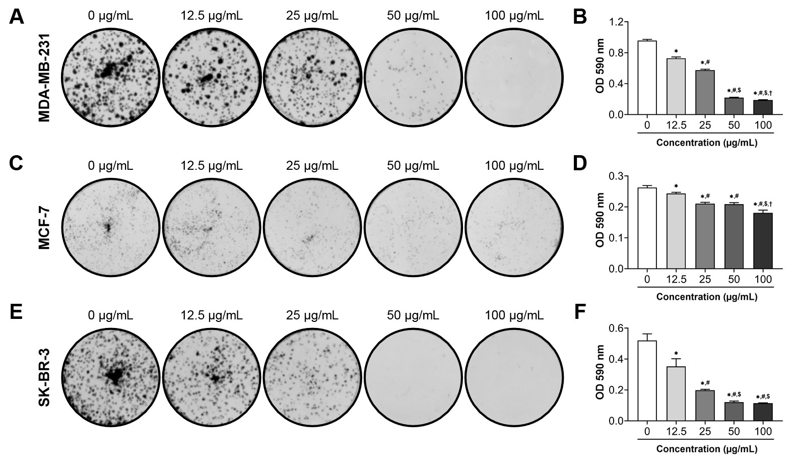 Figure 5 Colony formation of breast cancer cells after treatment with TCE for 24 h. A clonogenic assay was performed on MDA-MB-231, MCF-7, and SK-BR-3 cells after 24 h of TCE treatment. Representative images of formed colonies in MDA-MB-231 (A), MCF-7 (C), and SK-BR-3 (E). The absorbance at 590 nm of crystal violet-stained colonies in MDA-MB-231 (B), MCF-7 (D), and SK-BR-3 (F). Data are expressed as mean ± SD (N = 3). * p < 0.05 vs. the untreated control (0 µg/mL), # p < 0.05 vs. 12.5 µg/mL, $ p < 0.05 vs. 25 µg/mL, † p < 0.05 vs. 50 µg/mL.