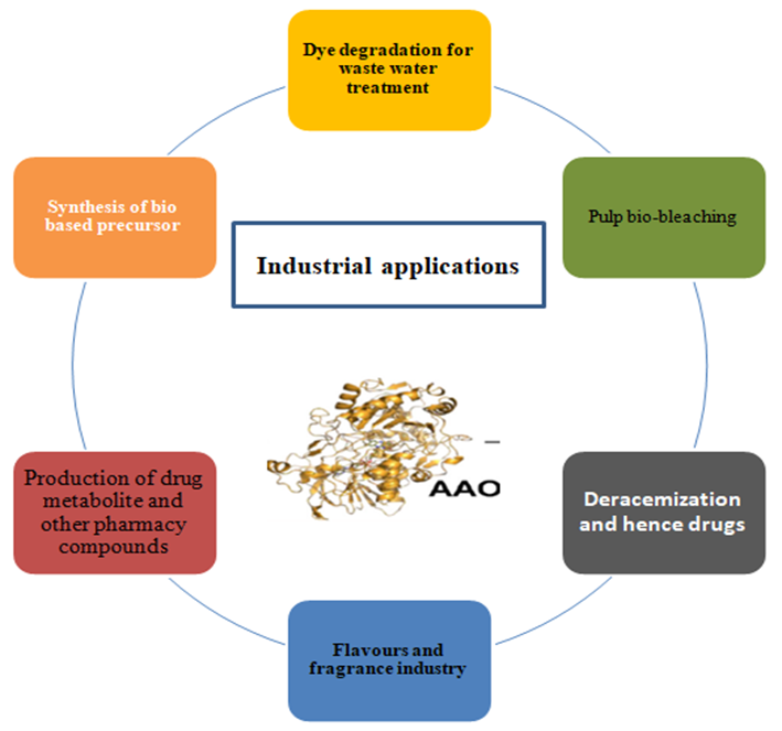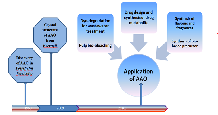 The 2nd most abundant biopolymer after cellulose is lignin, which has a very complex structure and its biological degradation required an enzymatic consortium of different lignin degrading enzymes like Lignin peroxidase (EC 1.11.1.14), Manganese peroxidase (EC 1.11.1.13), Versatile peroxidase (EC 1.11.1.16), Laccase (EC 1.10.3.2) etc. This enzyme required hydrogen peroxide for its action which is supplied by auxillary enzyme like aryl alcohol oxidase. Aryl alcohol oxidase belongs to glucose methanol choline (GMC) superfamily and has FAD as the cofactor. The structural aspects of the enzyme are compared using PeAAO and MtAAOas model. The mechanistic and substrate chemistry of aryl alcohol oxidase as alcohol or aldehyde oxidase is discussed in detail. The enhance activity as alcohol oxidase of ‘aryl alcohol oxidase’ using electron donating substrate, which is opposite when its aldehyde oxidase activity is considered. The application of the enzyme as an efficient dye degrading enzyme for wastewater treatment biologically, or in paper-pulp bio-bleaching, or drug design make it a hot topic of research for various industrial purpose and commercialization. Other mentionable application of the enzyme, is in the production of flavours and fragrances like vanillin, benzaldehyde, trans-2-hexanal, trans-2-cis-6-nonadienal, piperonal, perillaldehydeetc. The role of the enzyme in the synthesis of bio-based precursors like HMF, FFCA or FDCA is also discussed.