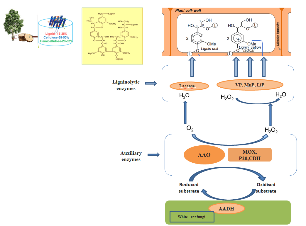 Figure 1 Systematic enzymatic consortium of ligninolytic and auxiliary enzymes of white-rot fungi in lignin degradation. Auxiliary enzymes are aryl alcohol oxidases (AAO), methanol oxidase (MOX), pyranose-2-oxidase (P2O) and cellobiose dehydrogenase (CDH), Ligninolytic enzymes include Versatile peroxidase (VP), Manganese peroxidase (MnP) and Lignin peroxidase (LiP). Other enzyme shown is aryl alcohol dehyderogenase (AADH).
