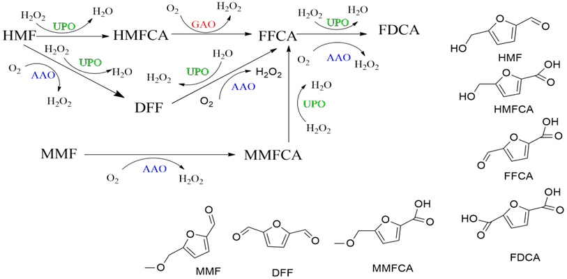 J Carro, E Fernández-Fueyo, C Fernández-Alonso, J Cañada, R Ullrich, M Hofrichter, M Alcalde, P Ferreira andAT Martínez. Self-sustained enzymatic cascade for the production of 2,5-furandicarboxylic acid from 5-methoxymethylfurfural. Biotechnology for Biofuels 2028;11, 86.