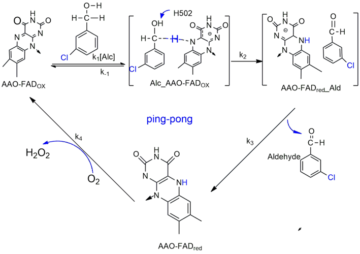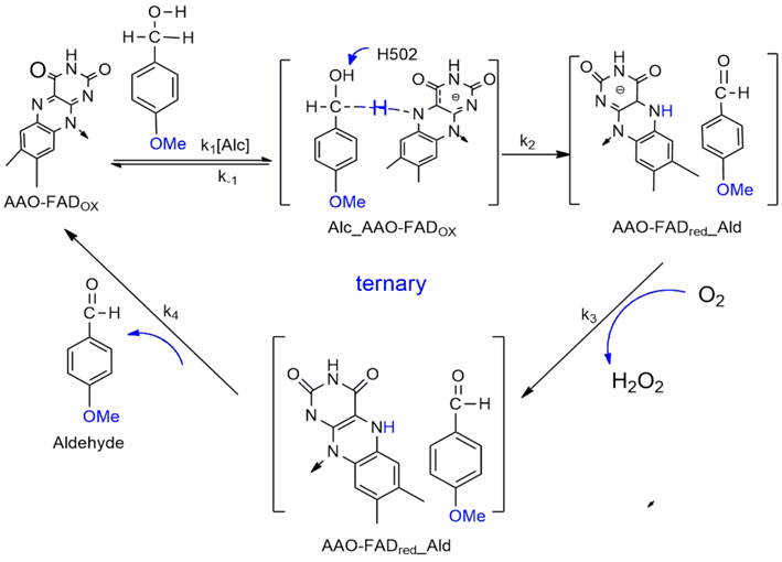 G Gadda. Hydride transfer made easy in the reaction of alcohol oxidation catalyzed by flavin-dependent oxidases. Biochemistry 2008; 47(52), 13745-13753.