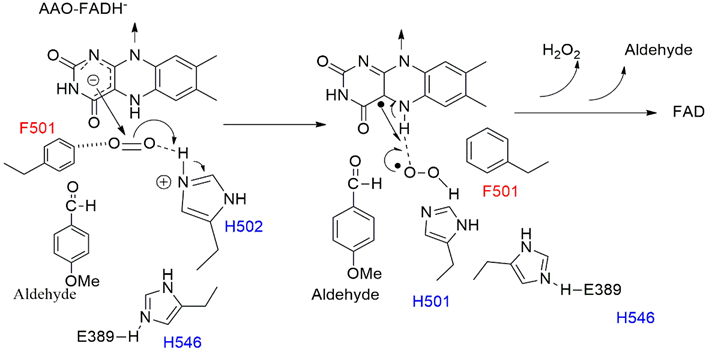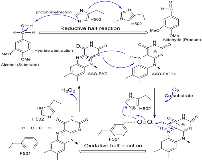 A Hernández-Ortega, F Lucas, P Ferreira, M Medina, VGuallar and AT Martínez.Role of active site histidines in the two half-reactions of the aryl-alcohol oxidasecatalytic cycle. Biochemistry 2012; 51(33), 6595-6608.
