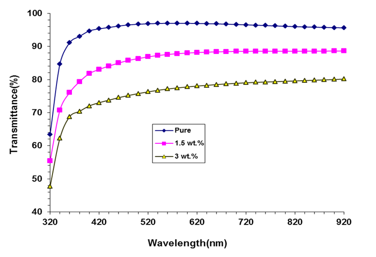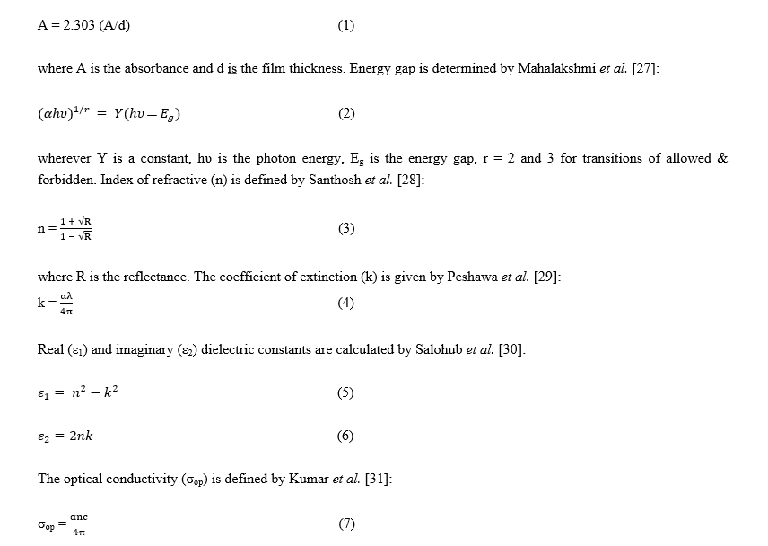 The used materials in the present work are chitosan as host matrix and SnO2-ZnO nanoparticles as a fillers. The CS/SnO2/ZnO films were prepared by dissolving of 1 g of chitosan in 50 mL of deionized water with 0.2 % of acetic acid using magnetic stirrer for 3 h at room temperature. The mixing procedure was repeated 4 times until the mixture was homogeneous. The solution was poured into a Petri dish (9 cm in diameter) and left at room temperature for a week to dry using the traditional casting method. In the method of fabrication of CS/SnO2/ZnO nanocomposite films, different weight percentage of (0, 1.5 and 3 wt%) were added to chitosan pure films separately to the above blend for 3 h, and the mixtures were cast and dried for a week by the same previous procedure. The samples’ thickness was measured using a micrometer and found to be within 30 μm. The (UV-18000AShimadzu) spectrophotometer was used to test the optical characters of CS/SnO2/ZnO nanocomposites. The optical microscope was utilized to observe the distribution of nanoparticles inside the polymer medium at 100 X. The coefficient of absorption (α) is given by Henaish and Abouhaswa [26]:
