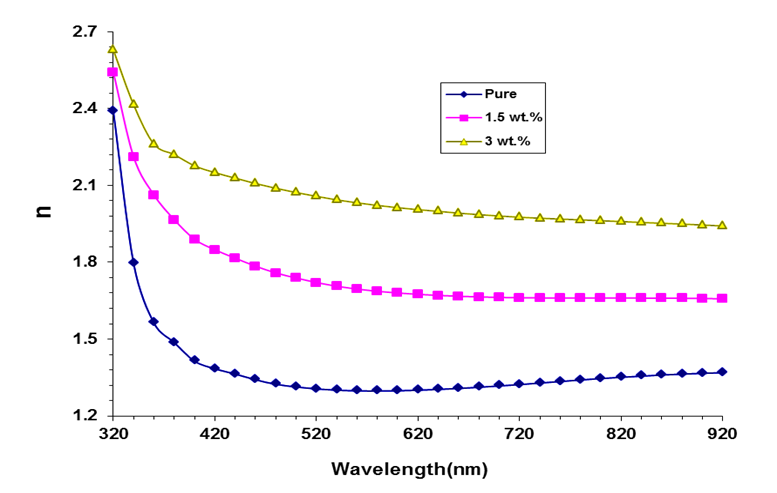 Figure 8 Performance of n with wavelength for Chitosan-SnO2/ZnO films.