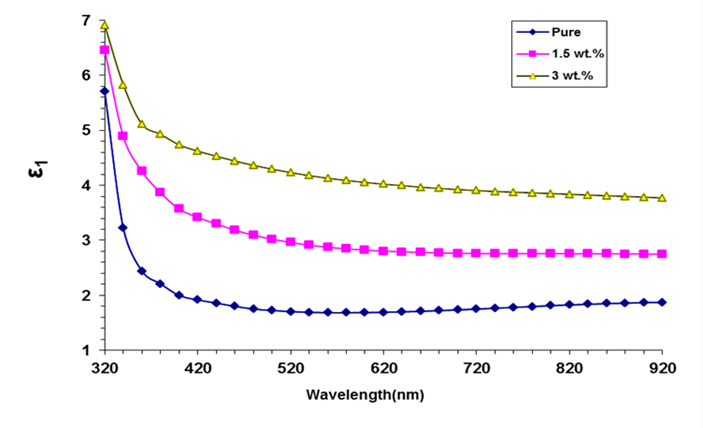 The real and imaginary dielectrics constants of Chitosan (CS) and Chitosan-SnO2/ZnO films are shown in Figures 10 and 11. The real dielectric constant decreases with rising photon wavelength. The ε2 values are reduce, then rise with rising photon wavelength. The addition of SnO2-ZnO into chitosan rises both the real (ε1) and imaginary (ε2) parts of the dielectric constant. It is concluded that the imaginary part (ε2) essentially depends on the values of the (k), which are connected to the variation of coefficients of absorption, while the variation of the real part (ε1) mainly depends on the values of the (n2) due to small values of (k2) [72-77].