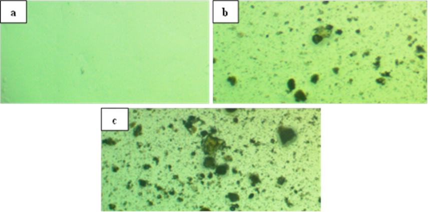Figure 1 shows the surface morphology images of chitosan doped with (0, 1.5 and 3 wt %) of (SnO2:ZnO), respectively. It’s clearly appear from the optical microscopy image that the polymer blend was homogeneously and perfectly dissolved in the solution, as shown in Figure 1(a). Figures 1(b) and 1(c) show that SnO2 and ZnO was well distributed on the surface of chitosan with uniform density. These results indicate that the molecules of dopant material tend to form well dispersed groups and may indicate the occurrence of a homogeneous growth mechanism. With grow NPs content, the NPs propagated as a clusters structure. At high concentration, the NPs shape a network of pathways inside the matrix of polymer material [32-38].