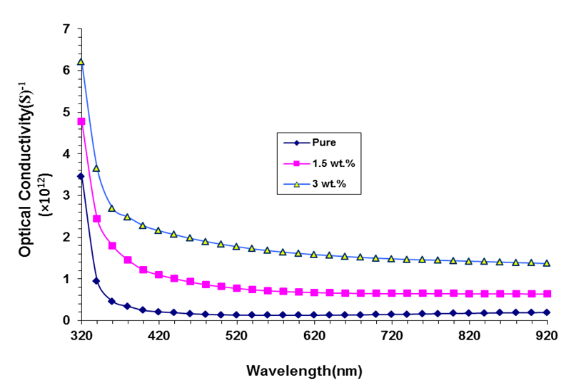 Figure 4 shows the optical conductivity as a function of the wavelength for Chitosan (CS) and chitosan-SnO2/ZnO films. The optical conductivity increases with rising SnO2/ZnO NPs content. It was observed from the figure that the optical conductivity at high photon energy (low wavelength) increased and vice versa at high wavelength. This may be due to enhancing free carrier density and modifying the band structure. These nanoparticles improve charge transport and light absorption through interfacial and crystallinity effects. Together, they enable more efficient photon-induced carrier excitation and mobility [51-54].