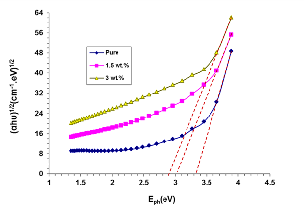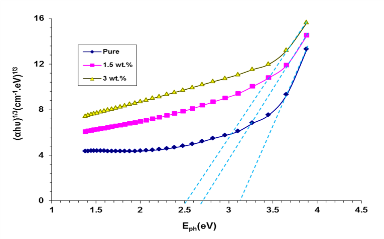 The value of allowed &forbidden energy gap of Chitosan (CS) and Chitosan-SnO2/ZnO films is illustrate in Figures 6 and 7, respectively. The addition of SnO2 and ZnO to chitosan introduces defect states and facilitates orbital hybridization, leading to the formation of new energy levels within the band gap. This results in a reduced energy gap from 3.33 to 2.9 eV for allowed transition &from 3.13 to 2.51 eV for forbidden transition due to easier electron transitions and modified electronic structure. the value of Eg reduce with increase of (SnO2/ZnO) nanoparticles [57-65].