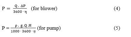 where E is energy consumption in kWh/day, P is power requirement in kW and t is operating hour of the equipment (hours/day). The power requirements for the equipment are estimated using the following formula: