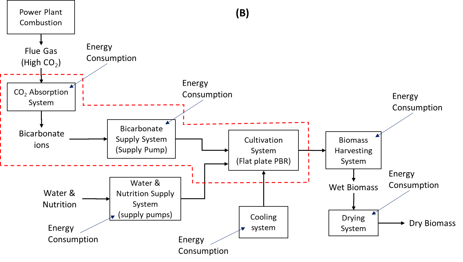A comparison between CO2-based and bicarbonate-based cultivation systems is essential due to their distinct operational characteristics, energy demands, and suitability for integration with industrial processes. Previous studies have reported varying outcomes in terms of biomass productivity, carbon utilization efficiency, and techno-economic performance [9-11], highlighting the need for context-specific evaluation. Such comparison are crucial for identifying optimal pathways to implement microalgal CCU technologies under different industrial and environmental conditions.
