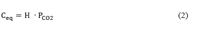 where TCO2 represents the rate of CO2 transfer from the gas phase (Cg) to the liquid phase (CL), driven by the concentration difference (Cg − CL), with kt denoting the overall transfer coefficient and S the effective interfacial area. The equilibrium solubility of CO2 in the liquid is determined by Henry’s law:
