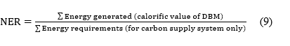 In terms of economic efficiency, the bicarbonate-based system outperforms the CO2-based system, with a NER value of 7.79 vs 0.85 for the CO2-based system. It was further backed by a low specific energy consumption of 7.29 kWh/Kg DBM generated for the bicarbonate-based system, as opposed to 0.79 kWh/Kg DBM for the CO2-based system. Although bicarbonate-based carbon supply systems use less energy than CO2-based systems, it is crucial to highlight that in this system, the alkali material recycling process must be used to reduce chemical purchase costs.