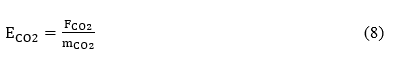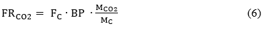 where MCO2 is the molar mass of CO2 (g/mole), MC is the molar mass of carbon (g/mole), FC is the carbon content in the algal biomass (%), BP is the biomass productivity (g/L/day), and FRCO2 is the fixation rate of CO2 (g/L/day).