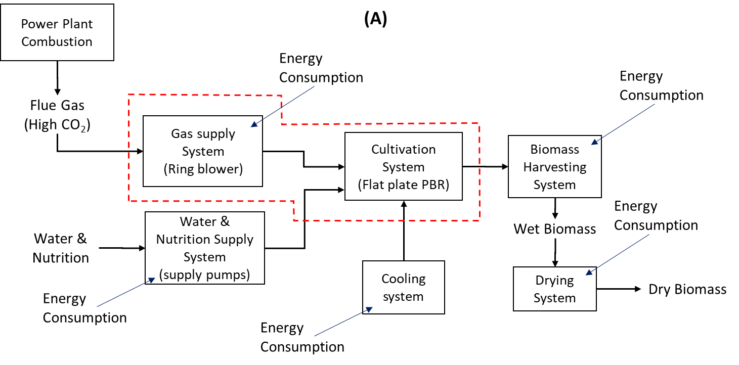 The simulations involved calculating the total gas flow requirements in each cultivation scenario to determine the power requirements of each equipment. Once power requirement of each equipment was identified, the estimated energy consumption of the carbon supply system was calculated using the following formula: