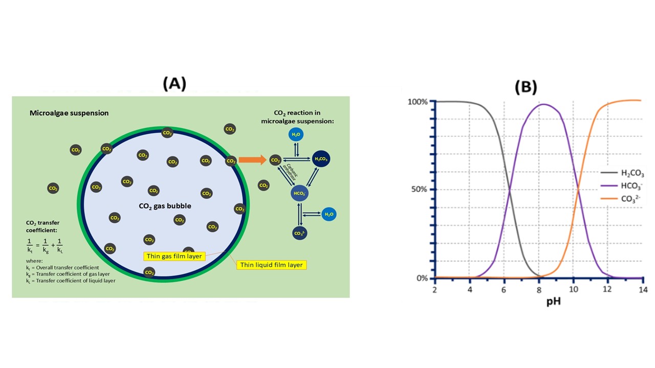 Figure 1 (A) CO2 dissolution from the gas phase into microalgae suspension [7]. (B) The percent distribution of DIC in microalgae suspension in various pH conditions [21].