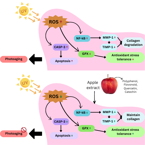 Exposure to ultraviolet (UV) rays increases reactive oxygen species (ROS), leading to activation of nuclear factor kappa B (NF-κB), Casp-3, and matrix metalloproteinase-1 (MMP-1), while decreasing GPX and TIMP-1. These changes promote apoptosis, reduce antioxidant stress tolerance, and cause collagen degradation, resulting in photoaging. Apple extract containing polyphenols, flavonoids, quercetin, and catechin reduces ROS, inhibits NF-κB and Casp-3, increases GPX and TIMP-1, thereby maintaining collagen structure and enhancing antioxidant stress tolerance, protecting against photoaging.