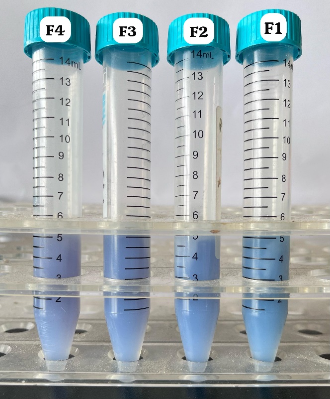 The active ingredients were formulated using a fixed concentration of star anise essential oil (1%) and butterfly pea extract (2.5%), both of which exceed their reported IC₅₀ values from previous studies. Star anise essential oil demonstrated antioxidant activity with an IC₅₀ of approximately 9.88 mg/mL (~0.98 %w/v) while butterfly pea extract showed potent activity with IC₅₀ values ranging from 4 mg/mL (~0.4 %w/v) in DPPH assays. Surfactant ratios of Tween 80 and Span 80 were varied to achieve different HLB values: F1 (6:4), F2 (7:3), F3 (8:2), F4 (9:1) as shown in Table 1. The formulation process followed the method described by [24]. First, the oil phase (containing star anise essential oil, PEG 400, and Span 80) and the aqueous phase (containing butterfly pea extract, Tween 80, ethanol 96%, and distilled water) were prepared separately and heated to 40 ± 2 °C. The oil phase was slowly added dropwise to the aqueous phase under continuous stirring. Both phases were then homogenized using a magnetic stirrer at 600 rpm for 5 min.