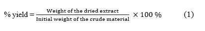 The sample extraction process according to Widyowati et al. [22] was extracted using 70% ethanol by maceration. A total of 500.0 g flowers were macerated in 5.0 L of 70% ethanol for 24 h, ensuring complete submersion of the powder, with periodic stirring to enhance extraction. The mixture had filtration through a Buchner funnel, followed by maceration until a consistent % brix was achieved, repeated 3 times. The filtrates from both maceration processes were then concentrated with a rotary evaporator at temperatures ranging from 45 - 55 °C to remove the solvent. The concentrated extract was oven-dried to a thick, constant-weight extract. Finally, extraction efficiency was determined based on the extract yield, which was calculated using Eq. (1).