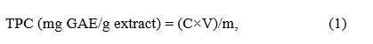 where C is the concentration of gallic acid obtained from the standard curve (mg/mL), V is the volume of extract used in the assay (mL), and m is the weight of the extract used (g).