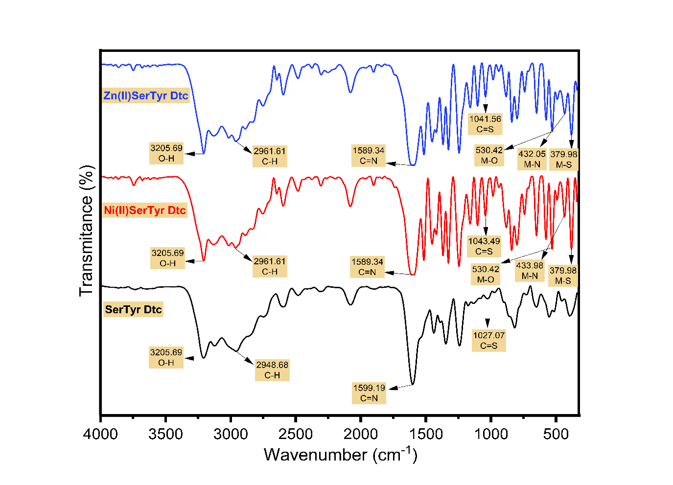 for Ni(II)Ser-Tyr Dtc and 68.77% for Zn(II)Ser-Tyr Dtc. The metal