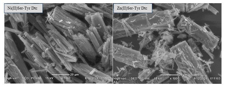 The metal complexes Ni(II)Ser-Tyr Dtc and Zn(II)Ser-Tyr Dtc were characterized based on their physicochemical properties. The metal complexes were dissolved in ethanol, and their electrical conductivities were measured using a Lutron CD-4303 conductometer. Subsequently, the metal complexes were placed into capillary tubes, and their melting points were determined using an Electrothermal IA 9100 melting point apparatus. The electronic spectra were then recorded using a Spectronic 20D+ UV-Visible spectrophotometer in the wavelength range of 200 - 800 nm. For FT-IR spectral analysis, the metal complexes were prepared as KBr pellets and analyzed with a Shimadzu Prestige-21 FT-IR spectrometer over a wavenumber range of 4000 - 340 cm-1. The crystal structures were confirmed using a Shimadzu XRD-7000 Maxima-90° diffractometer with a step interval of 0.02° per step, generating diffractograms of diffraction angle (2θ) versus peak intensity. Furthermore, the morphology, particle size, and elemental composition of the metal complexes were examined using a JEOL JCM-300 Plus SEM-EDS instrument.