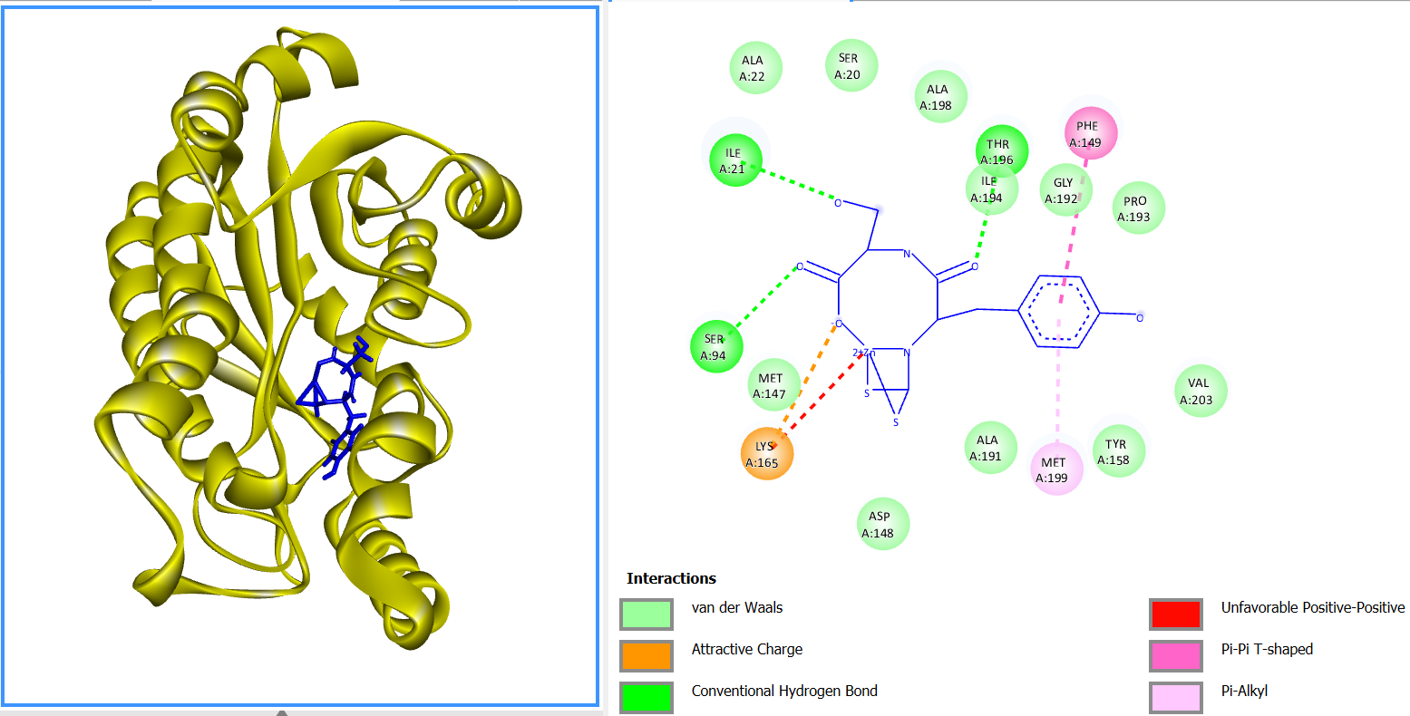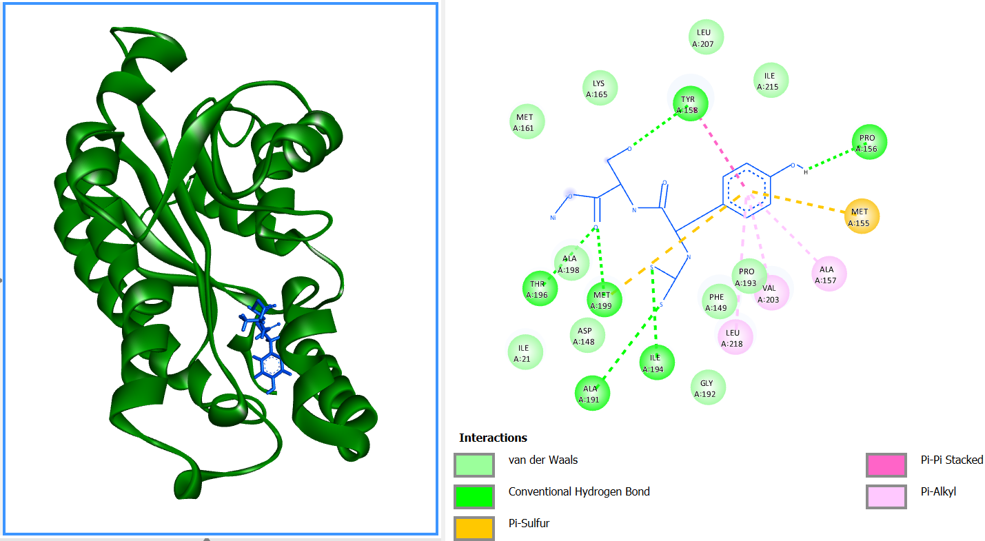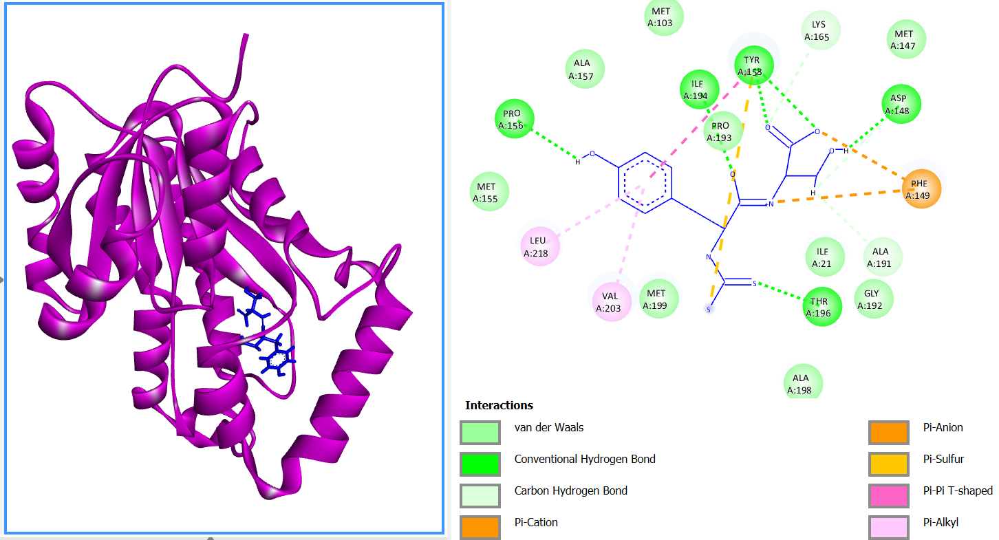 The molecular docking study commenced with the retrieval of the crystal structure bearing PDB ID 2X23 from the Protein Data Bank (https://www.rcsb.org/structure/2X23). The compound 5-hexyl-2-(2-methylphenoxy)phenol was employed as a positive control [20]. Four ligands were selected for docking, namely Ni(II)Ser-Tyr Dtc, Zn(II)Ser-Tyr Dtc, Ser-Tyr Dtc and isoniazid (INH). Preparation of the protein and the reference ligand was conducted using YASARA software, which involved the removal of non-essential components such as bound ligands, cofactors, and water molecules. Ligand preparation was performed using MarvinSketch at physiological pH (7.4), and the initial structures were saved in .mrv format. Subsequently, the .mrv files were reopened in MarvinSketch, and a conformational search was carried out using the “Conformers Search” function to generate multiple low-energy conformers. The resulting structures were exported in .mol2 format. Both protein and ligand files were then subjected to molecular docking using the PLANTS software, with protein.mol2 and ligand.mol2 as the respective input files. The docking pose yielding the highest score was considered to represent the most probable binding orientation of the ligand within the active site of the target protein. Based on this pose, the root-mean-square deviation (RMSD) value was calculated using YASARA. The docking protocol was deemed valid if the RMSD value was less than 2 Å (1 Å = 10-10 m) [21].