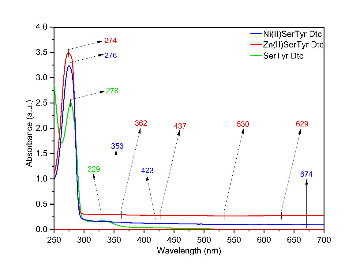The UV-Vis spectroscopic analysis of the Ni(II) Ser-Tyr Dtc and Zn(II) Ser-Tyr Dtc complexes is presented in Figure 4. Band I exhibited a shift within the range of 276 - 423 nm for the Ni(II) complex and 274 - 437 nm for the Zn(II) complex, corresponding to an intraligand n→π* transition associated with the CS2 group. Complexes containing C=S moieties typically display intense absorption bands in the 250 - 320 nm region, attributed to π→π* and n→π* electronic transitions [24,25]. In dithiocarbamate-based complexes, absorption in the 310 - 400 nm range is indicative of n→π* transitions within the N=C=S group. Additional absorption bands observed at 400 - 423 nm for Ni(II) and 400 - 437 nm for Zn(II) complexes suggest the occurrence of charge transfer (CT) transitions between the ligand and metal center (ligand-to-metal and metal-to-ligand). Furthermore, absorption in the 643 - 674 nm range for Ni(II) and 530 - 697 nm for Zn(II) indicates an extended conjugation system in the complexes compared to the free ligands, as well as the presence of d-d transitions characteristic of transition metal complexes [26]. These observations collectively confirm the formation of metal-ligand bonds in the synthesized complexes.