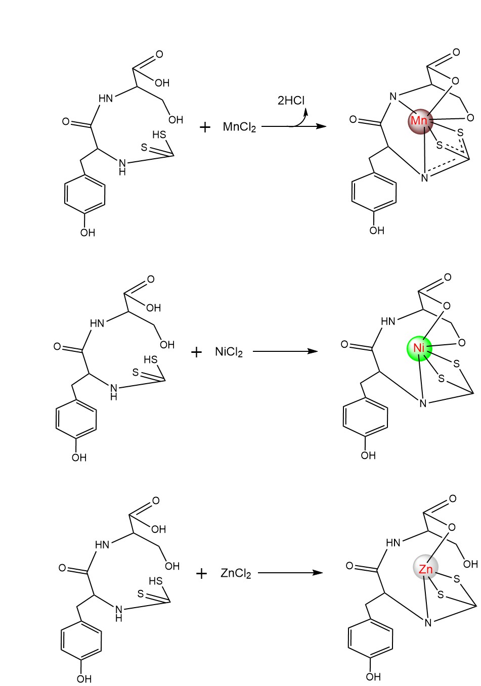 The Ni(II) complex was prepared by adding 10 mL of a 0.7130 g (3 mmol) NiCl2·6H2O ethanolic solution into 10 mL of a serine-tyrosine dithiocarbamate ligand solution (1:2 molar ratio) and stirring for 30 min. Similarly, the Zn(II) complex was synthesized by mixing 10 mL of a 0.4088 g (3 mmol) ZnCl2 ethanolic solution with 10 mL of a serine-tyrosine dithiocarbamate ligand solution (1:2 molar ratio) and stirring for 30 min. The resulting precipitate was filtered, dried in a desiccator, and recrystallized with ethanol to obtain pure crystals. The synthesis reaction of Ni(II) and Zn(II) complexes with serine-tyrosine dithiocarbamate ligands is illustrated in Figures 2 and 3.