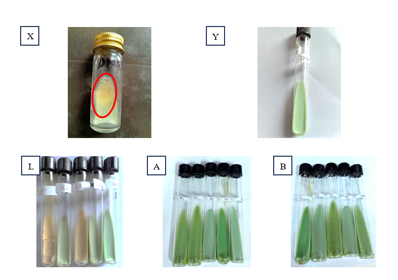 Description : + = slight growth *** = contaminated (spoiled) ++ = moderate growth ─ = sensitive (no growth) +++ = confluent growth (resistant) dx = day-x |