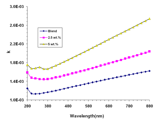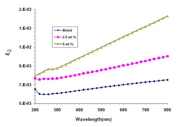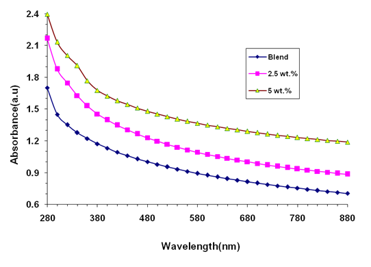 A casting procedure was used to create nanostructured films of barium titanate (BaTiO3) doped polyethylene glycol (PEG), and polymethyl methacrylate (PMMA). The casting method is straightforward, cost-effective, and easy to fabricate. BaTiO3 (50 nm, high purity (99.99%) was obtained as nanopowder form US Research Nanomaterials, Inc. To create a PEG-PMMA polymeric film, 1 g of PMMA and PEG were dissolving in the chloroform of 30 mL with 50 wt.% PMMA + 50 wt.% PEG by employing the magnetic stirrer for 1 h at room temperature. BaTiO3 NPs were added to a PEG/PMMA solution at concentrations of 2.5% and 5%. Nanostructured films of BaTiO3/PEG-PMMA made with thickness of 90 μm which was measured using digital micrometer. An optical microscope was used to analyze the distribution of BaTiO3 NPs in the PEG/PMMA matrix. FTIR analysis for PEG-PMMA/BaTiO3 films verified by FTIR (Bruker). The optical properties of BaTiO3/PEG-PMMA nanostructured films were evaluated via a spectrophotometer (Shimadzu). The optical characteristics of BaTiO3/PEG-PMMA nanostructures were investigated at wavelengths ranging from 280 - 880 nm. Figure 1 displays the experimental part diagram. The extinction coefficient (k) is defined by [35]: