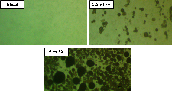 Figure 3 displays the optical microscope image for (PEG-PMMA/BaTiO3) films at (100x) for all films. This Figure depicts the dispersion of BaTiO3 nanostructures inside a PEG-PMMA matrix. At low concentration, the nanoparticles form a clusters inside polymer matrix. With increasing the content of NPs provides a link of pathways inside the plastic matrix, permitting carriers of charges to travel across the nanocomposites films, resulting in a change in material characteristics [44-51].