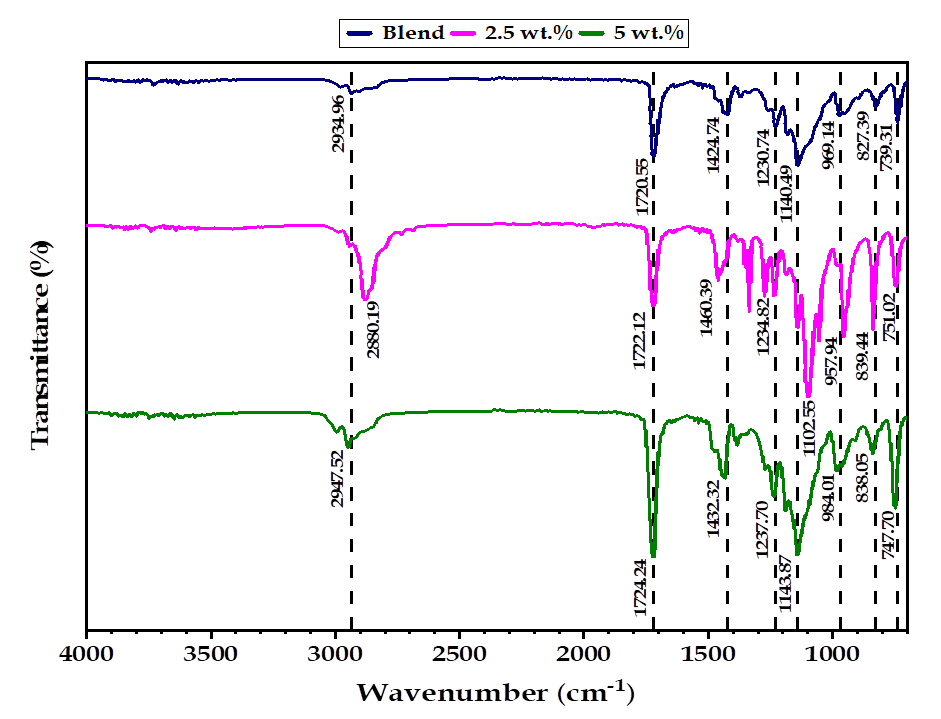of PMMA and PEG. The peaks at (1424.74) cm−1
