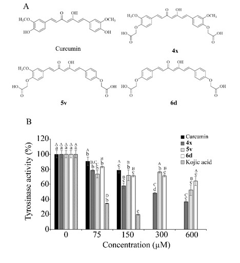 Previously, Somsakeesit et al. [17] synthesized and reported histone deacetylase inhibitory activity of curcumin derivatives for anticancer development. Meanwhile, our study focused on carboxyl-containing derivatives, specifically 4x, 5v, and 6d (Figure 1(A)). Although some carboxyl-containing compounds exhibit strong tyrosinase inhibition, the tyrosinase inhibitory activity of these particular bis(carboxymethoxy) curcumin derivatives has not been investigated until now.