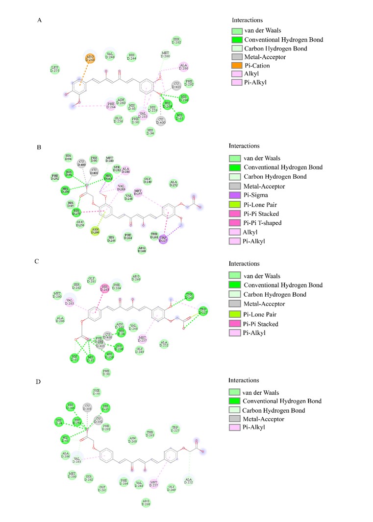 Figure 3 Bis(carboxymethoxy) curcumin derivatives-tyrosinase complex. (A) Curcumin, (B) 4x, (C) 5v, and (D) 6d-tyrosinase complex. The interactions between the complexes are indicated by the dashed lines. The figure was created and modified from Discovery Studio 2017 R2 Client.