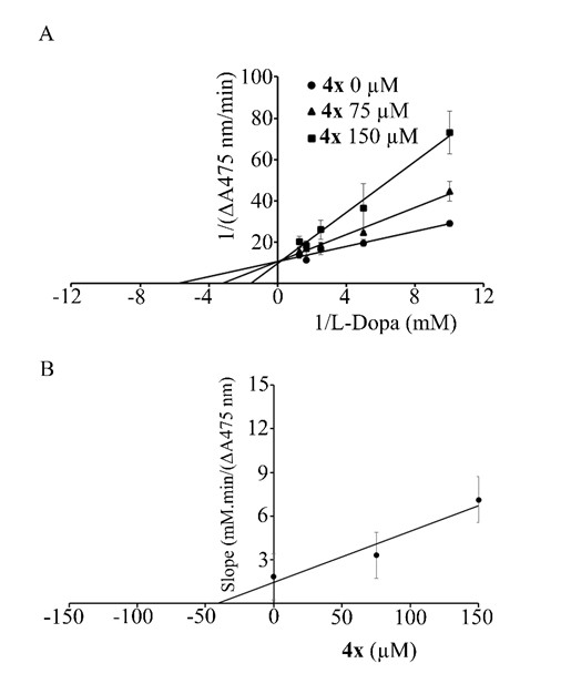 Figure 4 Kinetic analysis of tyrosinase inhibition by 4x. (A) Lineweaver-Burk plot and (B) the slope replot between 4x concentration (0 to 150 µM) and slope. Tyrosinase activity was measured using L-Dopa concentrations ranging from 0.1 to 0.8 mM in the presence and absence of bis(carboxymethoxy) bismethoxycurcumin (75 to 150 µM). The data are represented as mean ± SD (n = 3).