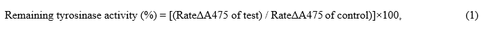 Tyrosinase activity was determined using a previously described method [18] with some modifications. Briefly, 50 μL of compounds (0 - 175 µM) were mixed with 40 μL of L-DOPA (4.50 mM in 125 mM phosphate buffer, pH 6.8) and 10 μL of tyrosinase (100 U/mL). The absorbance was recorded continuously every 30 s using a microplate reader at 475 nm at 25 °C. The linear slope of the plot between absorbance at 475 nm and time (min) was determined as the initial rate (ΔA 475/min). DMSO served as the negative control, while kojic acid served as the positive control. The remaining tyrosinase activity was calculated using the following Eq. (1):