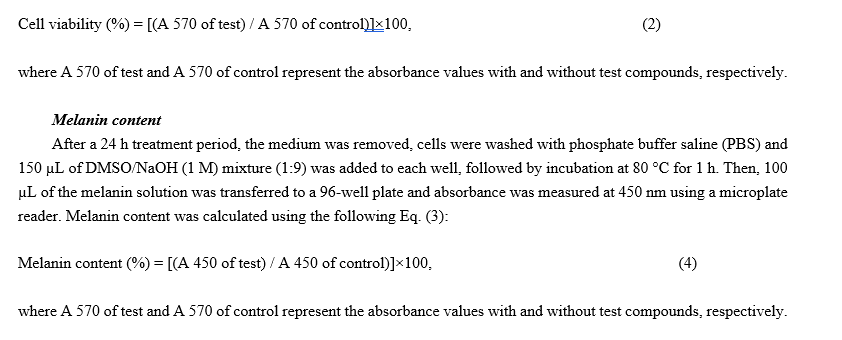 2,2′-Azino-bis (3-ethylbenzothiazoline-6-sulfonic acid) diammonium salt (ABTS), DPPH (2, 2-diphenyl-1-picrylhydrazyl), 6-hydroxy-2,5,7,8-tetramethylchroman-2-carboxylic acid (Trolox), mushroom tyrosinase, 3,4-dihydroxy-L-phenylalanine (L-Dopa), dimethyl sulfoxide (DMSO), and 3-[4,5-dimethylthiazol-2-yl]-2,5-diphenyltetrazolium bromide (MTT) were purchased from Sigma Aldrich (USA). Kojic acid was obtained from TCI (Tokyo, Japan). Fetal bovine serum (FBS) was supplied by Hyclone (USA). Dulbecco's Modified Eagle Medium (DMEM), Antibiotic-Antimycotic, and trypsin-EDTA were purchased from Gibco (USA).
