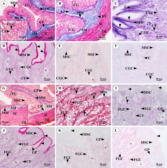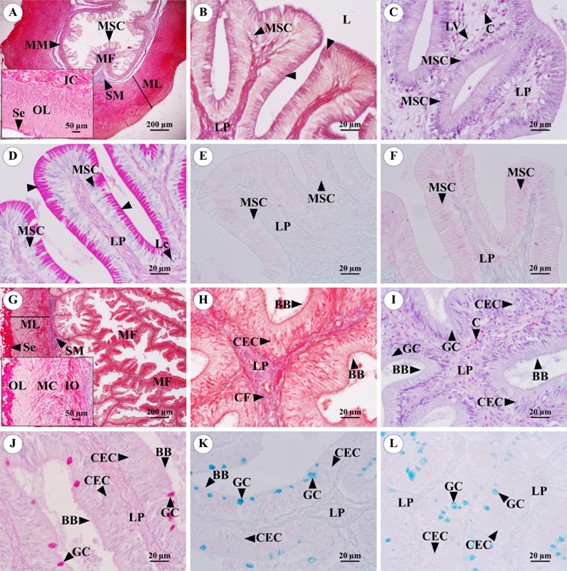 The difference between the pharynx and esophagus lied in the transition from the stratified squamous epithelium of pharynx to the stratified squamous/cuboidal epithelium of the esophagus, furthermore, the number of epithelial cell layers was also different. The globular unicellular mucous cells and goblet cells were positively stained with PAS (Figure 2(J)), AB pH 2.5 (Figure 2(K)) and pH 1.0 (Figure 2(L)), whereas the basal cells were negatively stained. The findings of positive-staining with PAS and AB pH 2.5 in M. favus was in accordance with to those observed in many fish [21,25,27,34,51], however, the cells were positively stained with AB pH 1.0, which was different from Odontesthes bonariensis [55] that were negatively stained with AB pH 1.0. For positively staining with AB pH 1.0 of cell of M. favus could demonstrate the presence of sulfated mucin, which contributed to high viscosity of the mucus that aided in trapping small particles.