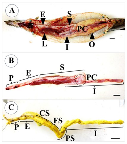 Figure 1 (1A) - (1C) The organs of digestive tract, consisting of pharynx (P), esophagus (E), stomach (S) and intestine (I), where the stomach containing three regions; cardiac stomach (CS), fundic stomach (FS) and pyloric stomach (PS). The dotted lone circle representing two pyloric caeca (PC). Liver (L) and ovary (O), with scale bar = 1 cm.