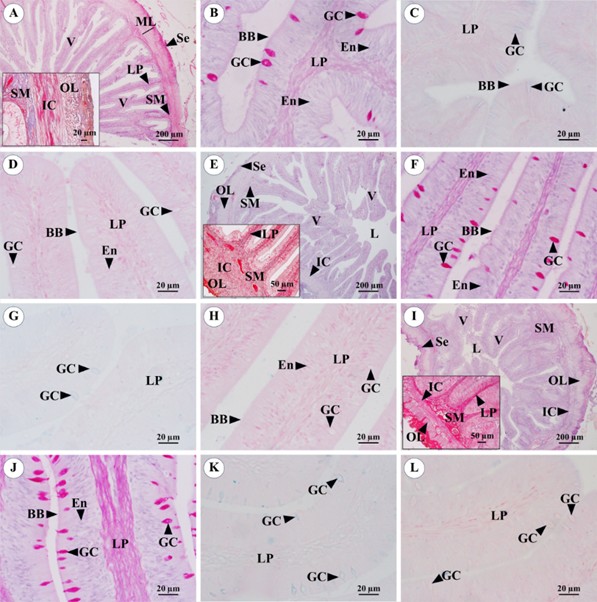 Figure 5 (5A) - (5D): Anterior intestine of M. favus. (5E) - (5H): Middle intestine of M. favus. (5I) - (5L): Posterior intestine of M. favus. (5A): Distinct layers and villi (V), consisting mucosa, submucosa (SM), muscular layer (ML) and serosa (Se). The box representing an enlarged view of submucosa and muscular layer (inner circular (IC) and outer longitudinal (OL) layers). (5B), (5C) and (5D): Villi of anterior intestine, with strongly PAS-positive, weakly AB pH 2.5-positive and AB pH 1.0-negative goblet cells (GC), respectively. (5E): Distinct layers and villi of middle intestine and the box illustrating an enlarged view of submucosa and muscular layer. (5F) - (5H): Strongly PAS-positive, weakly AB pH 2.5-positive and AB pH 1.0-negative goblet cells, respectively. (5I): Distinct layers and villi of posterior intestine and the box illustrating an enlarged view of submucosa and muscular layer. (5J) - (5L): Strongly PAS-positive, weakly AB pH 2.5-positive and AB pH 1.0-negative goblet cells, respectively. Brush border (BB), enterocyte (En), lamina propria (LP), lumen (L). (5A, 5E, 5I: H&E), (5B, 5F, 5J: PAS), (5C, 5G, 5K: AB pH 2.5), (5D, 5H, 5L: AB pH 1.0), (the box in (5A), (5E), (5I): MT).