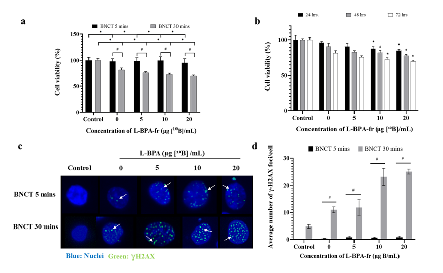 Figure 4 Biological effect of BNCT on HKBMM cells. (a) Cell viability of HKBMM cells after boron-neutron radiation for 5 and 30 min. (b) Cell viability of HKBMM cells at 24, 48 and 72 h after boron-neutron radiation for 30 min. (c and d) DNA damage (white arrow) after boron-neutron irradiation was determined via γ-H2AX assay. *p < 0.05 VS control, #p < 0.05 VS BNCT 5 mins. The values were expressed as mean ±SD (n = 3).
