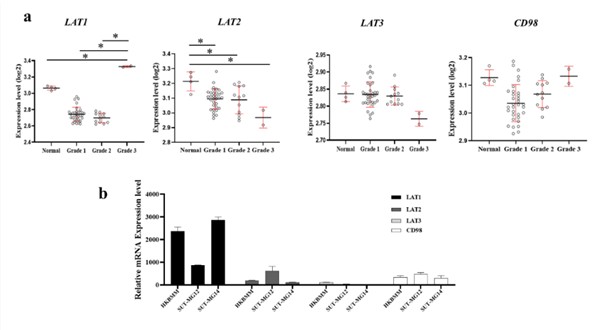 Figure 2 L-type amino acid transporter (LAT) expression in meningiomas. (a) LATs expressions were obtained from gene expression database (GEO series GSE43290). (b) LATs expressions in all meningioma cell line were determined via qPCR. The values were mean ± SD (n = 3). *p < 0.05 VS Normal.