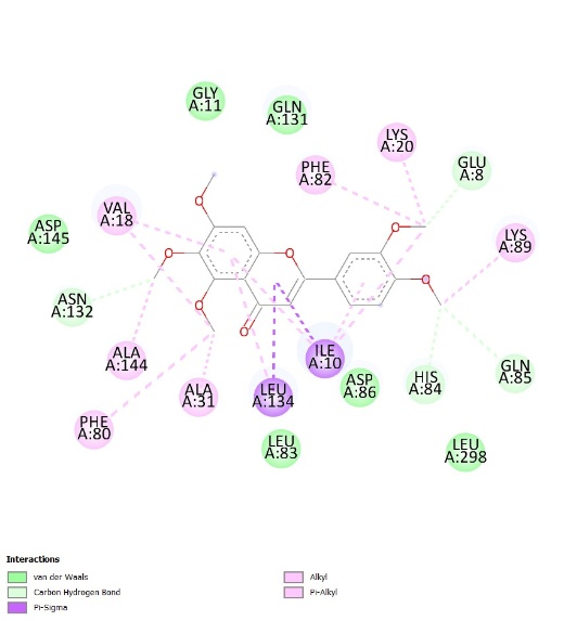 The structures of 19 compounds reported in the literature [25-27] from C. aurantiifolia peel: murrayacarpin A; 2,4,4´,6´-tetrahydroxy benzophenone; evodin; bergaptol; crocetin; nobiletin; tangeretin; scoparone; sinensetin; and tetramethylscutellarein, 5-geranyloxy-7-methoxy coumarin; 5-geranyloxypsoralen; 8-geranyloxypsoralen; methyl isolimonate acetate; europetin; luteolin; limonin; 3ˋ-hydroxygenkwanin; and myricetin as a reference drug (ligand) for breast cancer were drawn on 2D sketch program available in ChemDraw Professional v16.0 software package. All ligands were converted into the AutoDock tool (version 1.5.7) and then saved in pdbqt format.