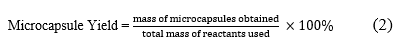 The yield refers to the quantity of microcapsules produced during the encapsulation process. This is a crucial factor in figuring out how well and whether it is possible to use C. aurantiifolia peel extract in business. A higher yield indicates better utilization of the extract and can lead to more cost-effective production methods. We determine the microcapsule yield by dividing the obtained mass of microcapsules by the total mass of reactants used. The equation serves as the foundation for calculating the microcapsule yield.