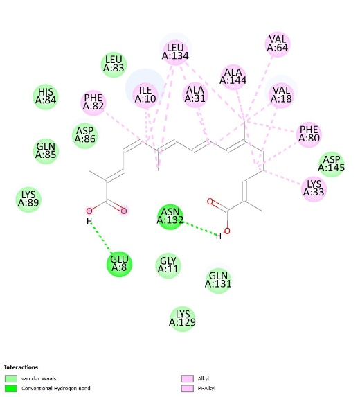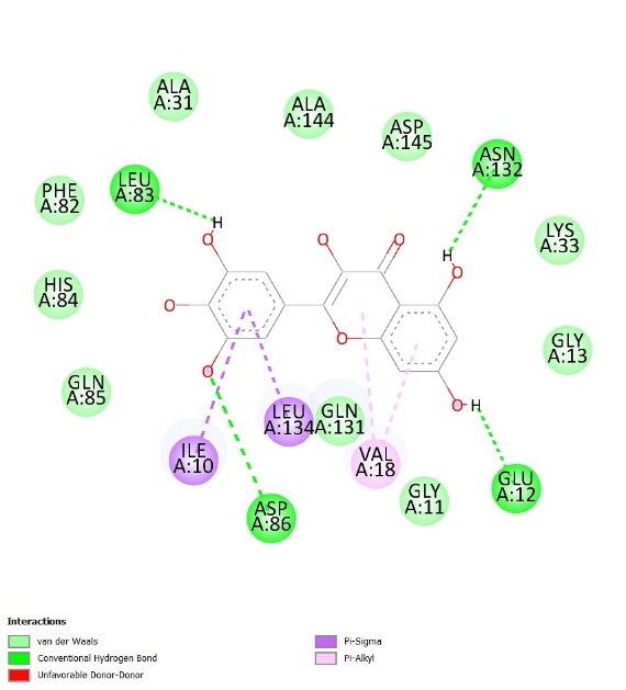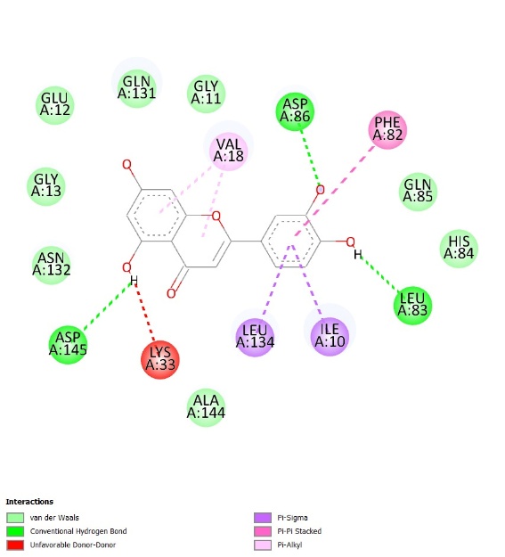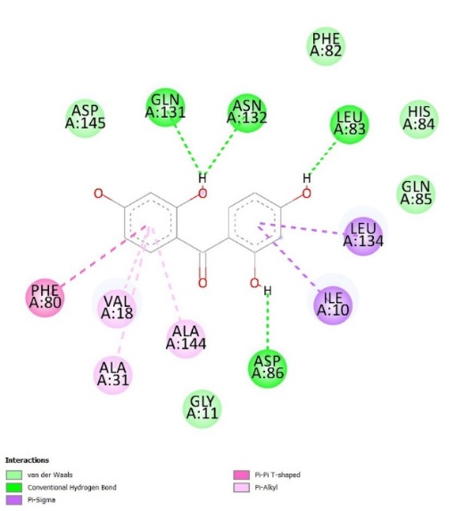 Whereas, in the case of the 3PY0 receptor, Asp145 and His84 are considered the essential amino acids. This participates in hydrogen bond development with the ligand and hence, helps maintain stability to the ligand-receptor complex, His84, on the other hand, takes part in the catalytic mechanism of CDK-2 about phosphorylation of the target protein. Ligand interactions with these residues change the activity of CDK-2, which can activate or inhibit the cell cycle in cancer cells [29,30].