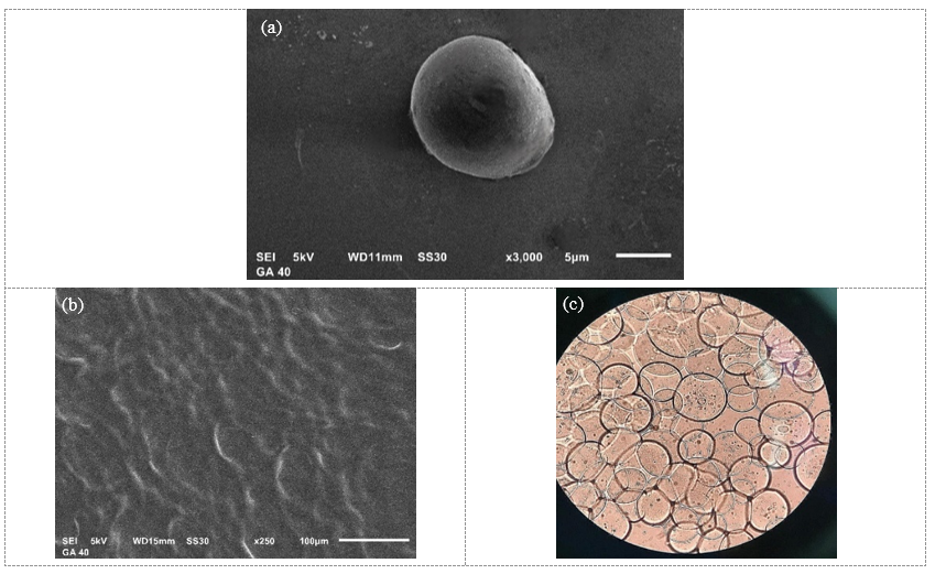 Next, we stirred the beaker containing the solution for 15 min at 60 °C and then added 2.5% (v/v) glacial acetic acid solution to adjust the pH of the mixture to 3.75. The solution was cooled to 10 °C. Microcapsules formed in the solution were added to 0.066% glutaraldehyde as much as 475 μL (varied). We raised the temperature of the solution to 35 °C and continued stirring for 3 - 4 h to complete the crosslinking reaction. We then cooled the solution to room temperature while stirring it. We filtered the microcapsules using a Buchner funnel and then washed them with water. We dried the microcapsules in a desiccator. We carried out this procedure in triplicate for all the different extracts.