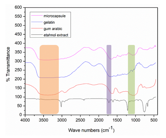 Meanwhile, the released mechanism follows a mix of 3 models: Higuchi, zero-order, and Hixson-Corwell. The Higuchi kinetics model uses the obtained regression to describe the release of the active substance from the solid matrix, typically through a diffusion process. The active substance releases proportionally to the square root of time, indicating a controlled release. This kinetics model typically applies to release systems that rely on diffusion in porous matrices, making it appropriate for matrix systems with homogeneous distribution of the active substance. The FTIR spectrum confirms that the extract and the coating on the microcapsules do not interact, allowing the extract to release through the coating's pores without any chemical interaction.