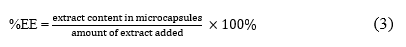 This metric measures the actual amount of the extract successfully contained within the microcapsules following the encapsulation process. This metric is crucial for assessing the effectiveness of the encapsulation method and guaranteeing the preservation of the extract's desired properties for its intended use. We determined the extract content (EC) by dividing the extract content in microcapsules by the total weight of the microcapsules produced. The EC calculation relies on the following equation: