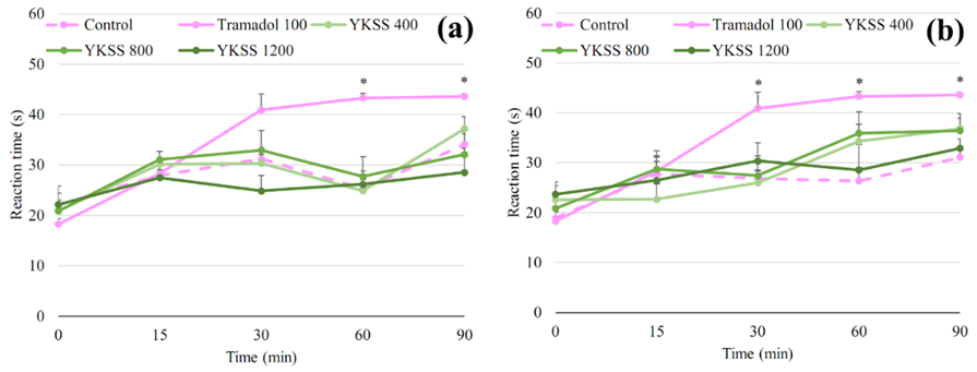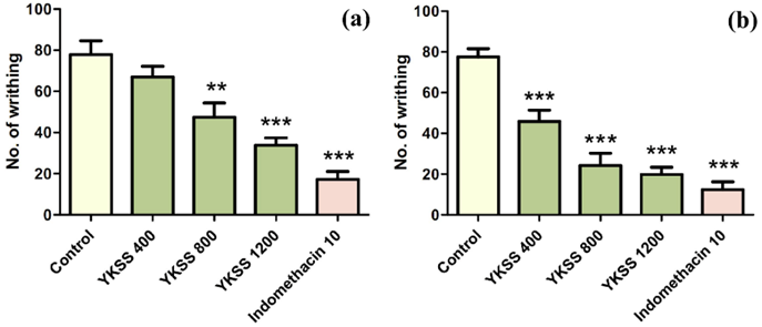 This study aimed to investigate the in vitro biological activities of YKSS, with a particular focus on its antioxidant, anti-inflammatory and cytotoxicity properties, alongside its in vivo acute toxicity and analgesic effects. The primary objective of this research was to evaluate the biological activities, safety and stability of YKSS, which have not been thoroughly studied despite its widespread use in traditional medicine. To achieve these objectives, in vitro assays were conducted to assess the biological properties and toxicity of YKSS, while in vivo studies were designed to evaluate its toxicity profile and analgesic effects in animal models. These methods were chosen to ensure a comprehensive assessment of the formulation’s therapeutic potential and safety, aligning with the study’s aim of bridging traditional knowledge with scientific validation. Although YKSS has been traditionally used, there has been limited scientific investigation into its biological activities and safety profile. By addressing this gap, our research provides empirical evidence to support the therapeutic potential of YKSS. To the best of our knowledge, this study is the first to comprehensively investigate the biological activities, safety and formulation stability of YKSS, establishing a scientific basis for its traditional use. Additionally, the stability of the formulation was assessed and a capsule formulation was developed to enhance its usability and practicality. The findings from this study contribute valuable insights into the scientific understanding of YKSS, highlighting its potential as a safe and effective alternative for managing musculoskeletal pain and related conditions while preserving the wisdom of traditional Thai medicine.