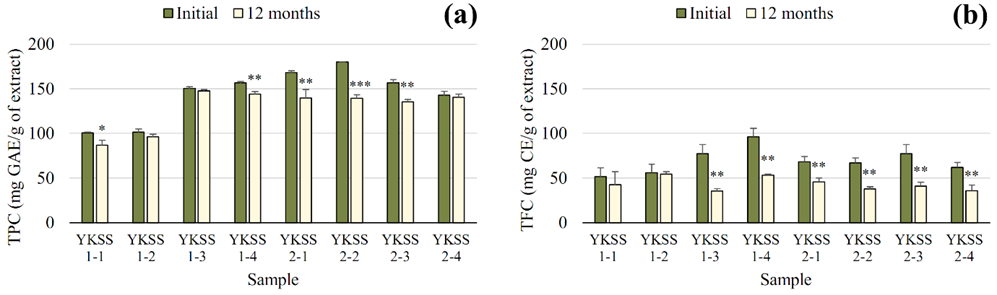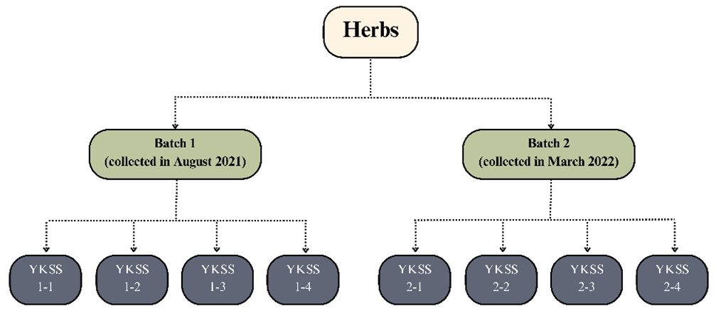 All herbs composed in the YKSS formula were obtained from Phra Ajarn Dhanes Jattabhayo, the monk at Wat Pacha Ban Kraisorn, Buached District, Surin Province, Thailand. The plant compositions of YKSS, including Thai common name, scientific name, family, part used and mass are shown in Table 1. The first and the second batches were obtained in August 2021 and March 2022, respectively. The first batch contained four samples coded as YKSS 1-1 to 1-4. The second batch contained four samples coded as YKSS 2-1 to 2-4, as shown in the diagram in Figure 1. They were identified by a plant taxonomist at the Department of Pharmacognosy, College of Pharmacy at Rangsit University to ensure the correct plant species. The voucher specimens were coded and deposited at the Drug and Herbal Product Research and Development Center, College of Pharmacy, Rangsit University. They were cleaned with tap water, boiled in 1.5 L of water for 15 min, filtered using cheesecloth and cooled before being freeze-dried by a freeze dryer for 18 - 20 h. The dried extracts were kept in a desiccator until used.